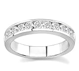 First -- I ordered this Tuesday afternoon and it arrived before lunch on Friday. I'm on the East Coast, so I expected another week's wait. It was well packed, sent USPS with tracking, and in a pretty gift box. Second -- the ring is BEAUTIFUL! The diamonds are white and flush with the band, so they won't catch. Without a loupe I can't see any flaws or occlusions. They're very sparkly and the color is good -- maybe better than H. There is a tiny hole in the band beneath each diamond. The band is bright white gold (probably rhodium-ed, but pretty) and smooth and even, a little thinner under the finger and slightly wider through the diamonds, but still slim -- less than 3mm at the thickest part. It seems to be true to size, and is light weight without being flimsy. There is a "10K" mark inside. The channel runs about halfway around the band, so the whole top across the finger shows diamonds. To get a ring this lovely for this price is amazing -- I'm sure it sells for more elsewhere!Get more detail about 10k White Gold or Yellow Gold Channel-Set Diamond Band (H/I2-I3, 3/4 ct. tw.).